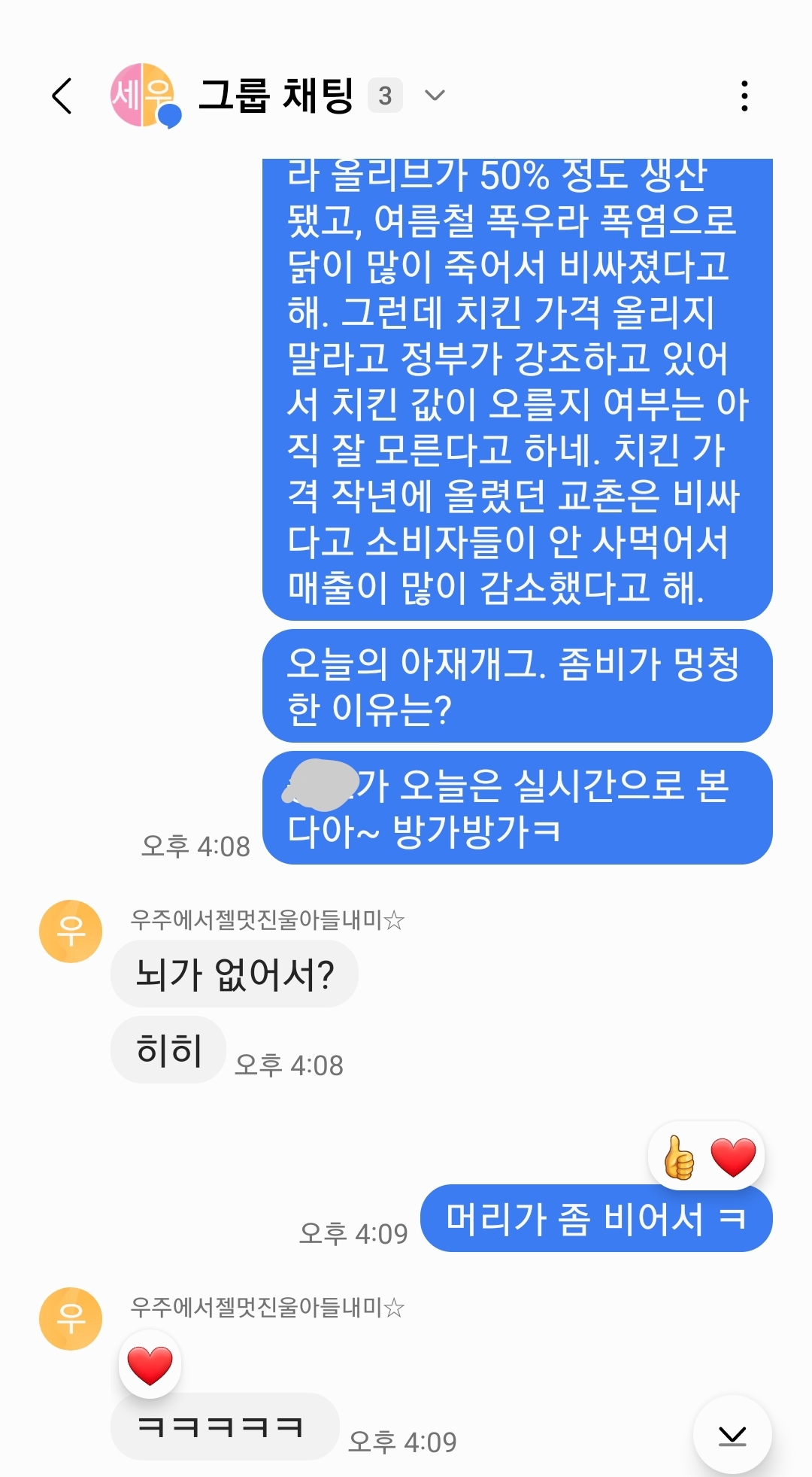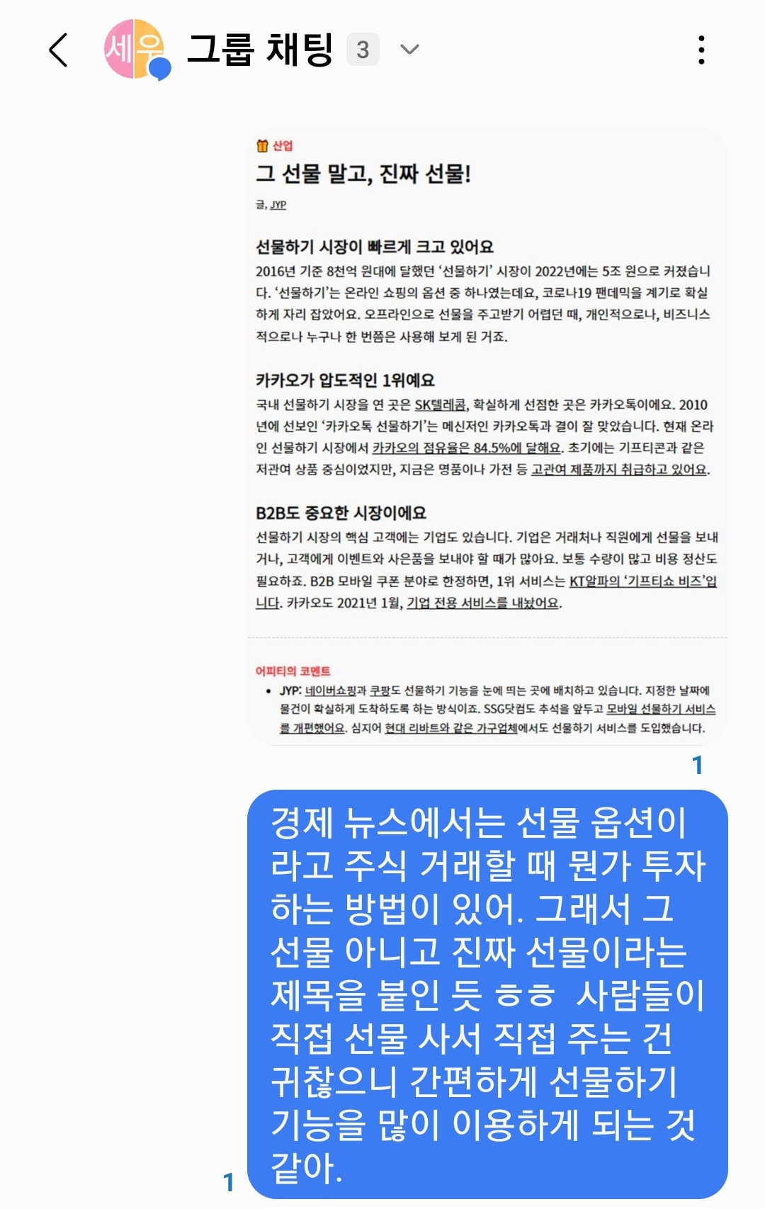 뉴스레터 정리한 내용만 보내면 재미 없을까봐 그 날 그 날 아재 개그나 문제적 남자 퀴즈 문제 같은 걸 마지막에 보내기도 합니다. 저 위에 근원 물가 같은 내용은 사실 저도 몰랐던 내용이에요 ㅎㅎ 뉴스레터에 자세하게 설명이 되어 있어서 알게된 내용입니다. 그런 것도 이렇게 간단하게 풀어서 보내주면 아이들이 편하게 읽을 수 있겠더라구요. 내용 보내고 나면 이렇게 간략하게 자기 의견 아이들도 단톡방에 올리기도 합니다