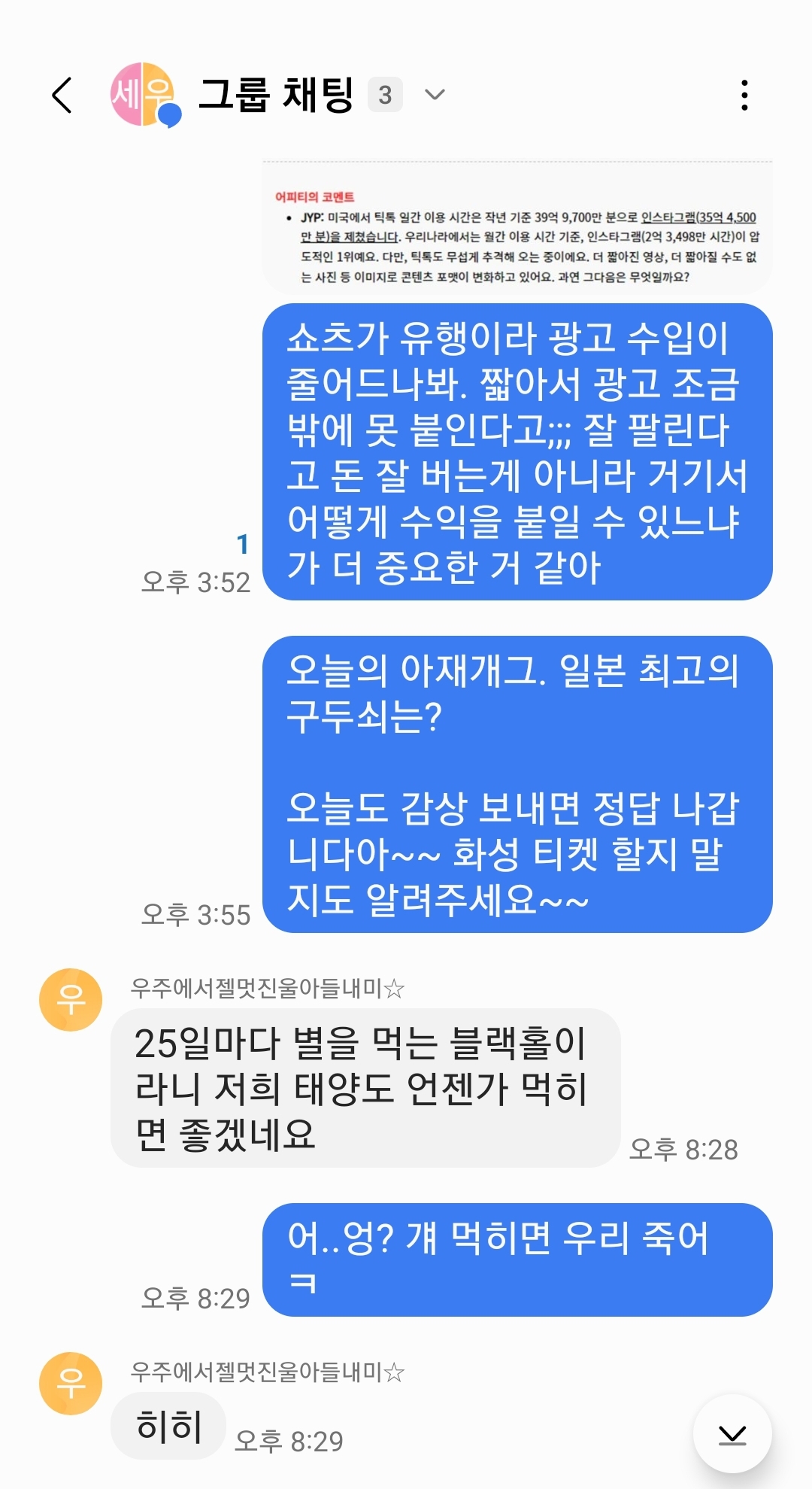 어.. 가끔은 이렇게 뉴스레터 내용과는 전혀 상관 없이 농담 따먹기만 하고 끝나기도 해요; 그래도 괜찮아요~ 어차피 이 모든 내용 전부 다 머리 속에 넣으려고 하는 것 아니고 이런 것도 있구나 하고 훑어 보다 보면 어느 순간 돌아보면 우리 사회와 여러 과학 분야에 대한 배경 지식이 스며들어 있을 거에요. 사실 가장 추천하는 방법은 종이 신문이나 잡지를 직접 같이 보면서 이야기 하는 건데요. 저희처럼 그런 시간 내기 힘들 경우에는 이렇게 단톡방을 이용하는 것도 차선책으로 괜찮은 것 같습니다. 그럼 다음에 또 재미난 이야기 가지고 올게요~