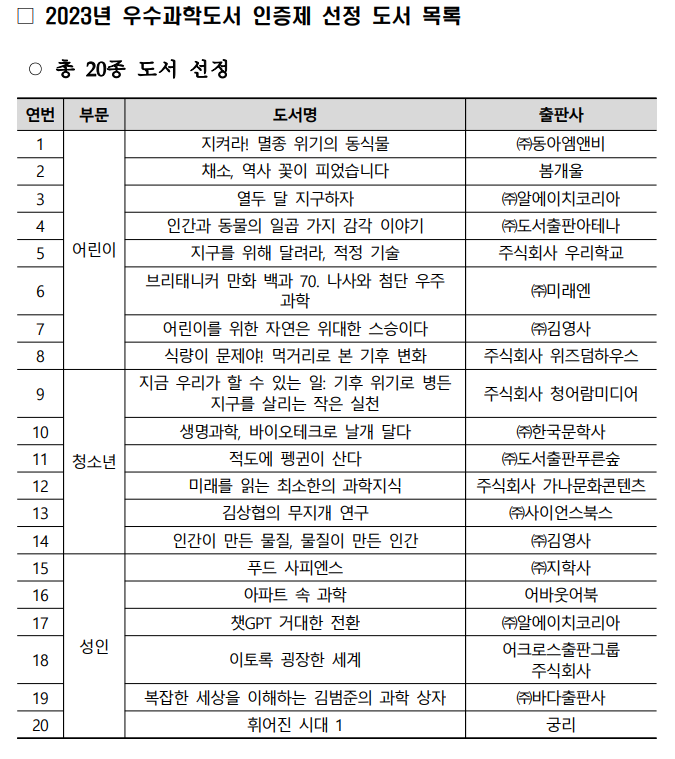 2023년 우수과학도서 인증제 선정 결과 안내 - 공지사항 - 재단 소식 - 공고/공지 - 한국과학창의재단 (kofac.re.kr)
