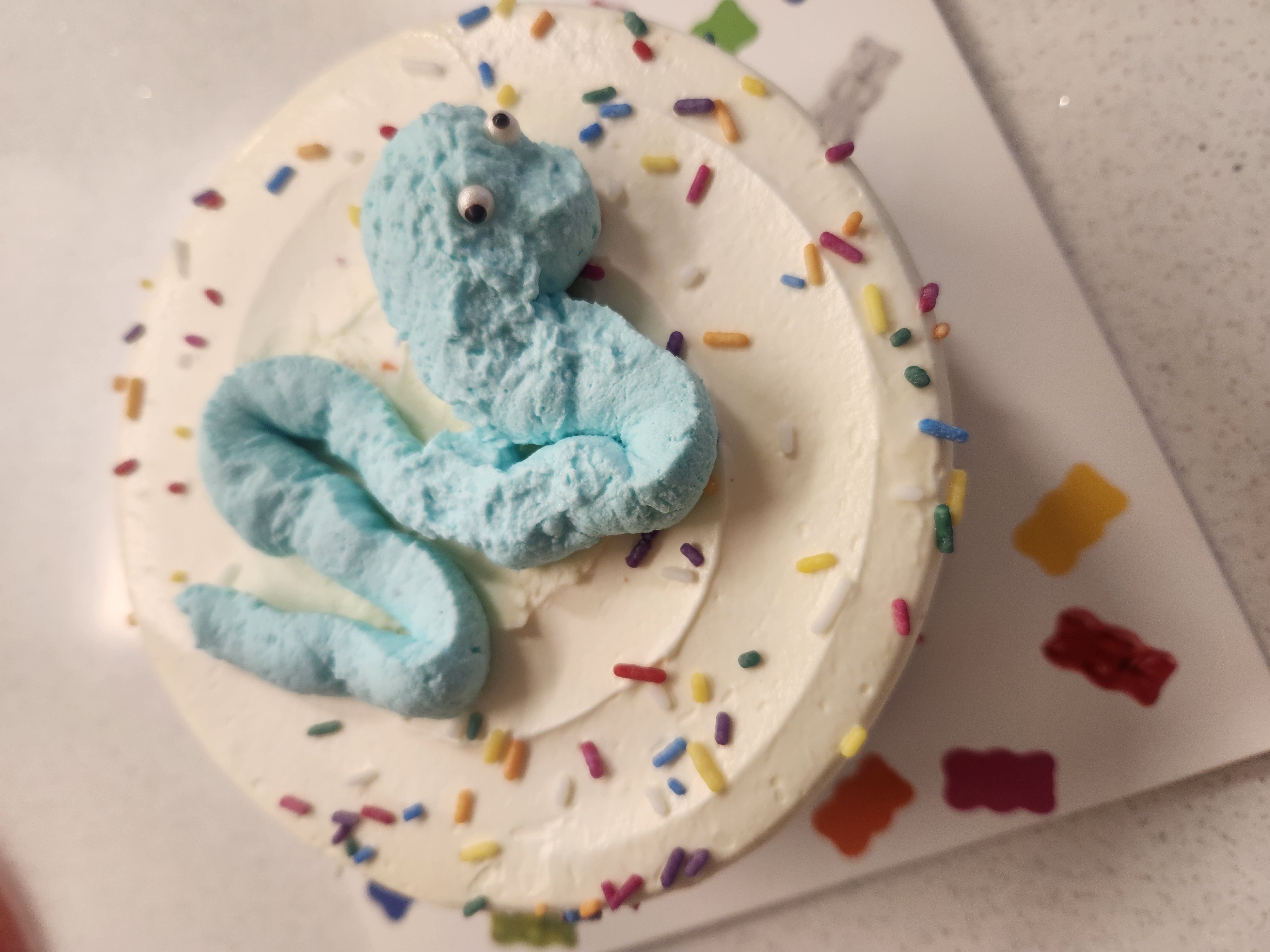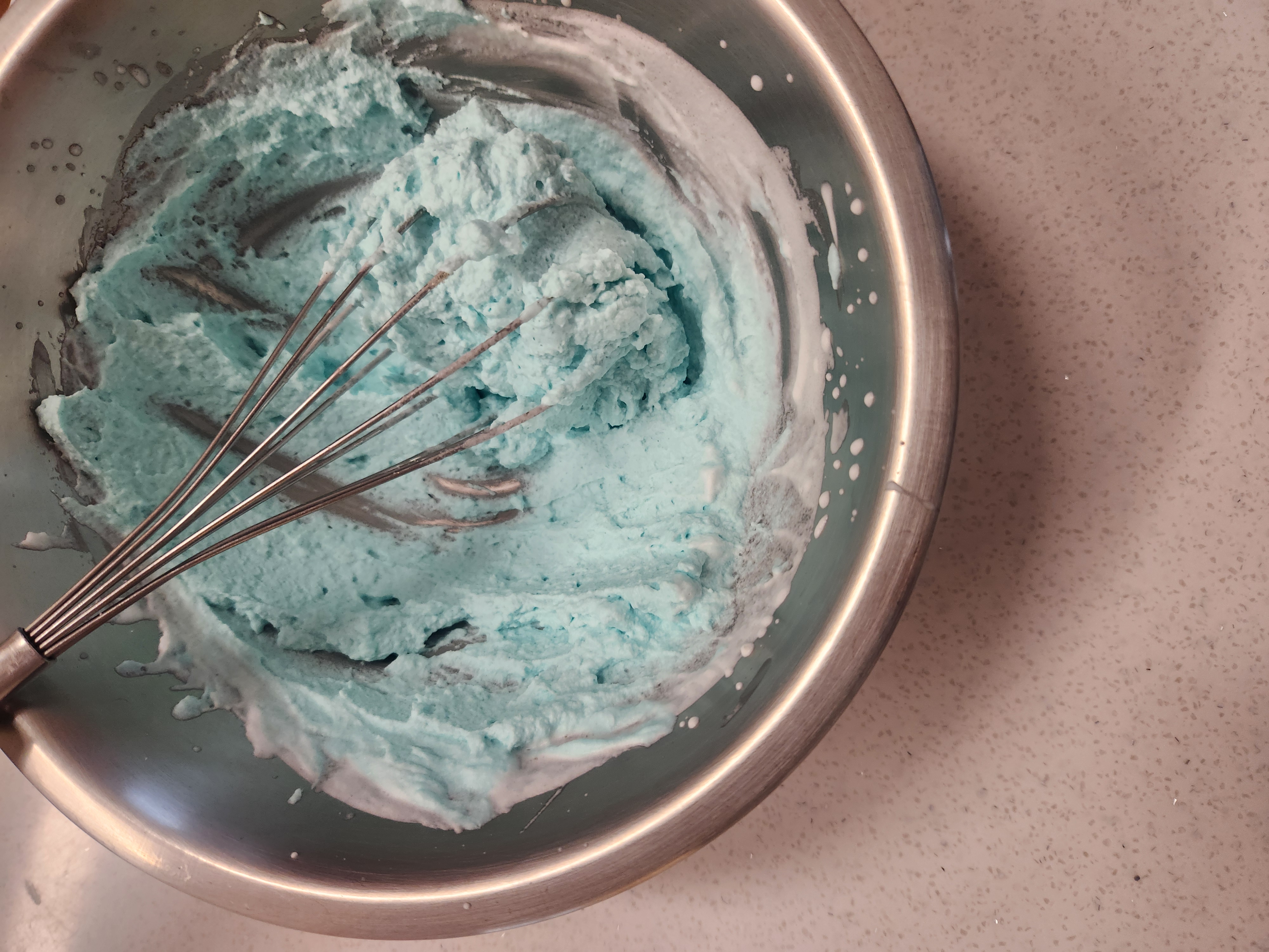 헉헉.. 열심히 손으로 휘저어 생크림을 만들고 파란 식용색소도 넣어서 파란 크림을 만들었어요! 이제 저 위에 예쁜 파란 뱀 모양으로 짜면 됩니다~