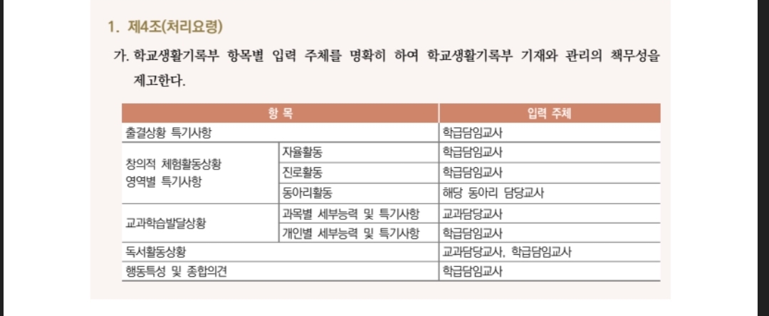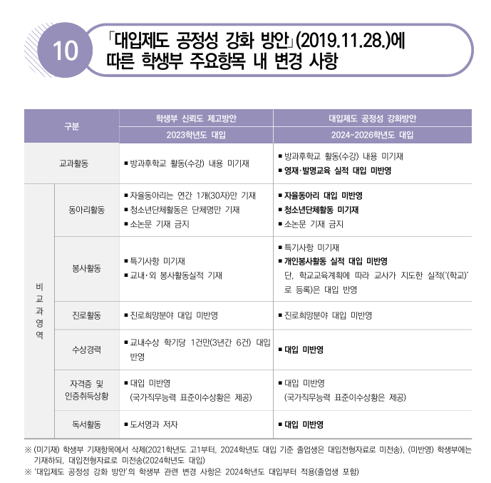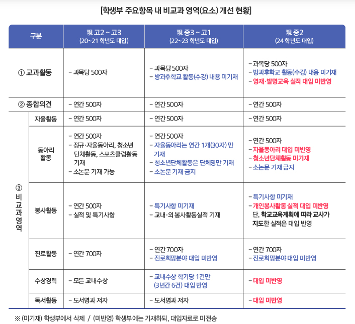 자율: 임원 여부 기재됨 동아리: 창체동아리 반영 (자율동아리 미반영/청소년단체활동 미기재/소논문 기재금지) 봉사: 교내봉사 반영 (특기사항 미기재/개인봉사 미반영) 진로: 진로희망분야 미반영, 내용은 반영 수상/독서 미반영 |