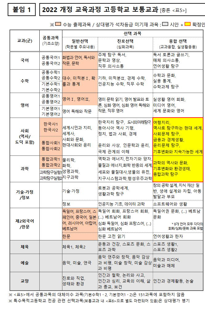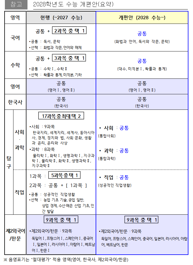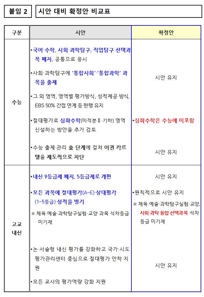 2028 입시부터 국어.수학.사회.과학 선택과목 없는 통합형 수능, 내신 5등급 체제 확정 - 지난 10월 10일 발표한 ‘2028 대학입시제도 시안’ 원칙적 유지 - 수능시험 출제에서 ‘심화수학(미적분Ⅱ.