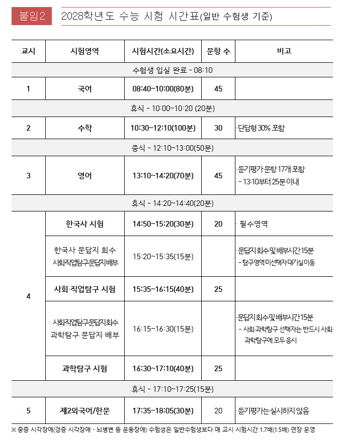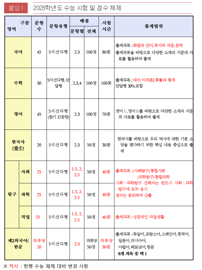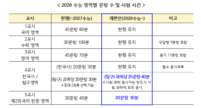 2028학년도 대학수학능력시험 시험 및 점수 체제 안내 - 2028 수능 국어.수학.영어 문항 수 및 시험시간 현행 유지 - 탐구 과목당 25문항, 40분간 응시(20문항 30분→25문항 40분) - 제2외국어·한문 과목