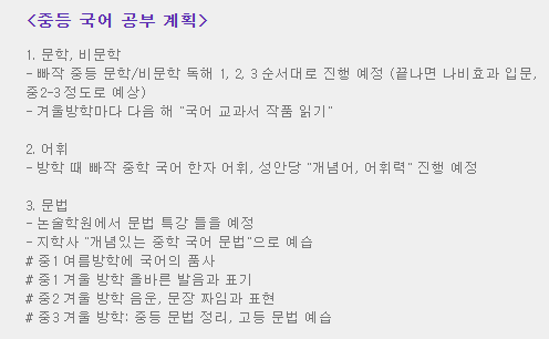 우선 예전에 올렸던 중등 공부 계획 정리한 내용이에요
