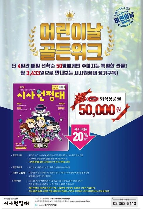 위의 링크로 들어가시면 어린이동아 공식 카페 가실 수 있습니다. 컴퓨터로 들어가니 메인 화면에 바로 이벤트 배너가 있네요~ 세번째에 있는 어린이날 골든위크 쓰여진 배너가 바로 시사원정대 정기구독 이벤트에요. 1년 이상 구독해야 하는데 20% 할인된 가격에 구독이 가능하고 거기에 빕스 외식 상품권 5만원짜리를 받으면 상당히 저렴한 가격에 괜찮은 잡지를 받아보는 셈이에요~