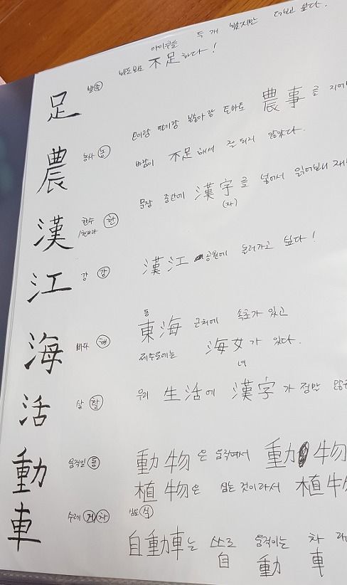 이번에 아이들과 해본 한자는 足 農 漢 江 海 活 動 車 입니다! 그냥 쓰다가 붓펜이 집에 있어서 이걸로 붓글씨를 흉내내서 써봤더니 아이들이 신기하다며 재밌어 하더라구요 ㅎㅎ