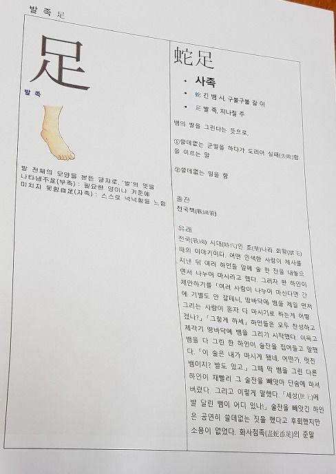 전국(戰國) 시대(時代)인 초(楚)나라 회왕(懷王) 때의 이야기이다. 어떤 인색한 사람이 제사를 지낸 뒤 여러 하인들 앞에 술 한 잔을 내놓으면서 나누어 마시라고 했다. 그러자 한 하인이 제안하기를 「여러 사람이 나누어 마신다면 간에 기별도 안 갈테니, 땅바닥에 뱀을 제일 먼저 그리는 사람이 혼자 다 마시기로 하는게 어떻겠나?」 「그렇게 하세」 하인들은 모두 찬성하고 제각기 땅바닥에 뱀을 그리기 시작했다. 이윽고 뱀을 다 그린 한 하인이 술잔을 집어들고 말했다. 「이 술은 내가 마시게 됐네. 어떤가, 멋진 뱀이지? 발도 있고.」 그때 막 뱀을 그린 다른 하인이 재빨리 그 술잔을 빼앗아 단숨에 마셔 버렸다. 그리고 이렇게 말했다. 「세상(世上)에 발 달린 뱀이 어디 있나!」 술잔을 빼앗긴 하인은 공연히 쓸데없는 짓을 했다고 후회했지만 소용이 없었다. 화사첨족(畫蛇添足)의 준말